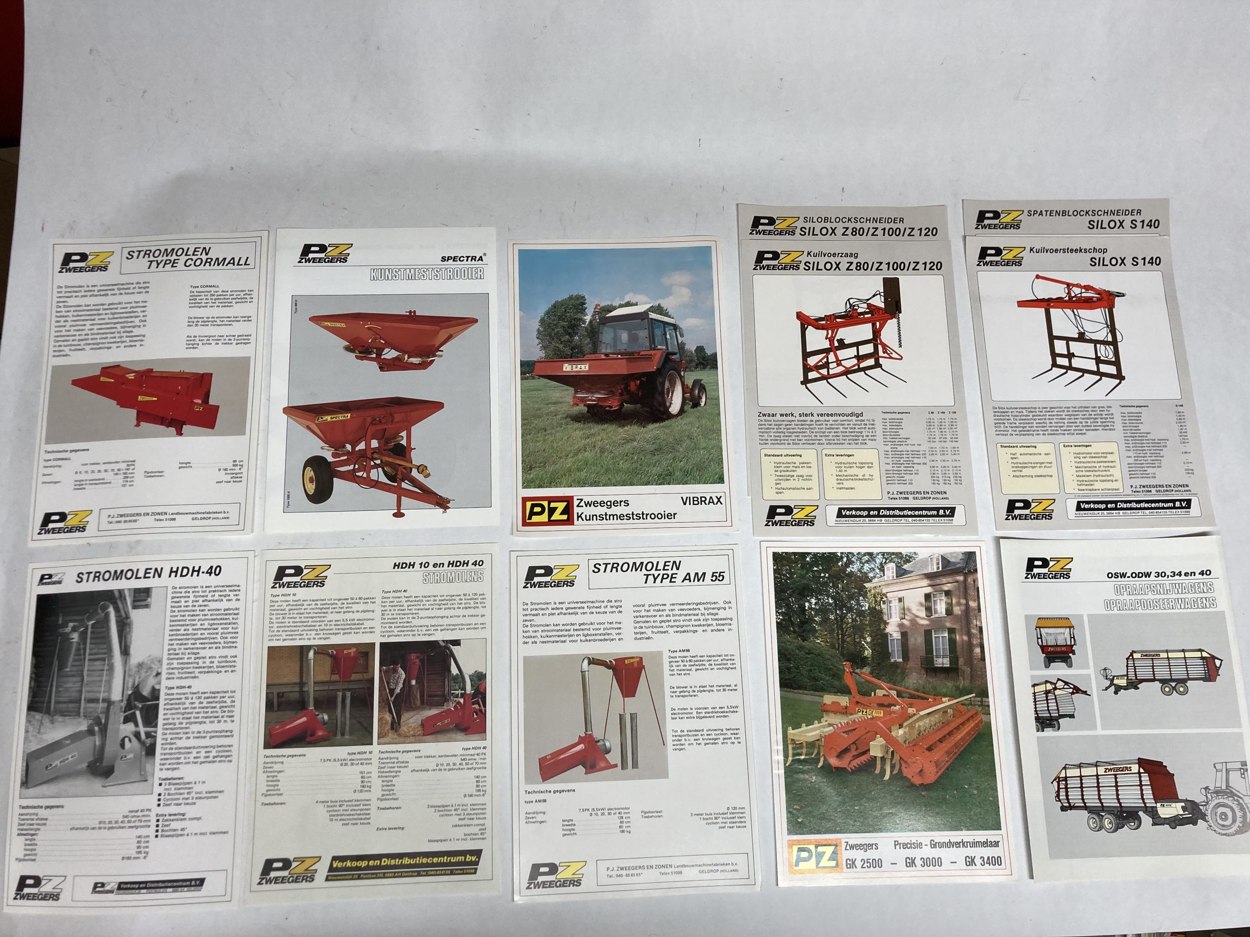 Set van 12 originele folders van PZ Zweegers Stromolens, Kunstmeststrooier, Kuilvoerzaag, Grondkruimelaar en Opraapwagen. Sommige folders zijn enkelzijdig, sommige dubbelzijdig, sommige dubbelzijdig over meerdere pagina’s.
